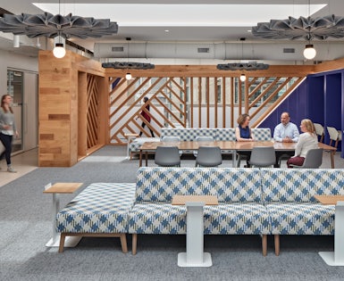 Fit-out of existing space on the 10th floor contains new glass offices, open ceilings with K13, exposed concrete flooring, bathrooms, MDF, storage rooms, phone booths, wellness room, and café. Flexible workspaces, private offices, and executive suites allow members to scale their offices as the company grows. The bright and modern office is designed for a fast-paced, communal work environment with floor to ceiling windows and extensive conference room space.